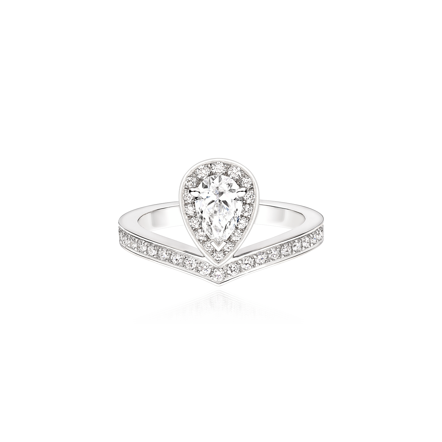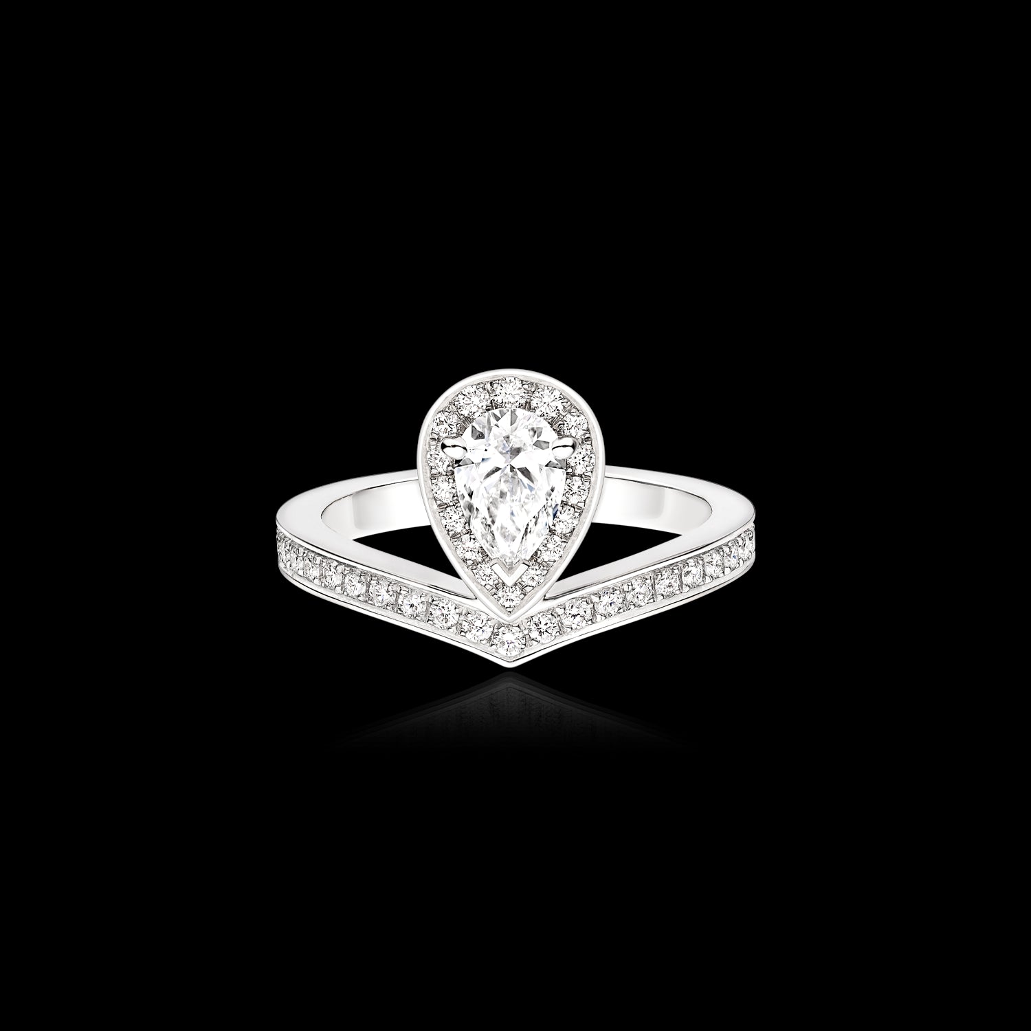 A criação de assinatura da Maison, o solitário Joséphine Aigrette, agora é adornado com um halo de diamantes. Uma homenagem à Imperatriz Joséphine, a primeira grande cliente e musa da Maison, o solitário reinterpreta o emblemático formato em V da aigrette. O majestoso diamante em talhe gota é realçado por um pavé de diamantes em talhe brilhante, que conferem luz e brilho a este anel de elegância intemporal.