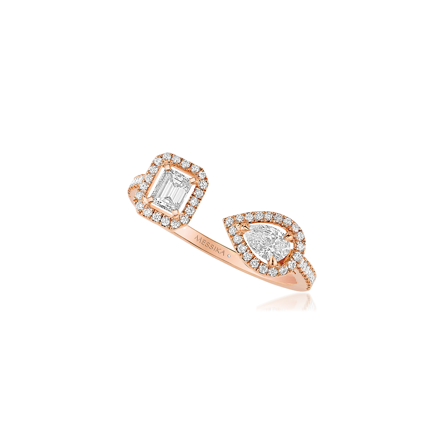 O anel de diamantes My Twin Toi & Moi 0.15ct em ouro rosa de 18 quilates combina o clássico intemporal Toi & Moi com o toque moderno de um anel aberto. O estilizado e hipnótico talhe esmeralda, responde ao sensual e cintilante talhe gota. Realçadas por um delicado conjunto de diamantes em talhe brilhante, as duas pedras de 0.15 quilates envolvem o dedo com uma luz cintilante.