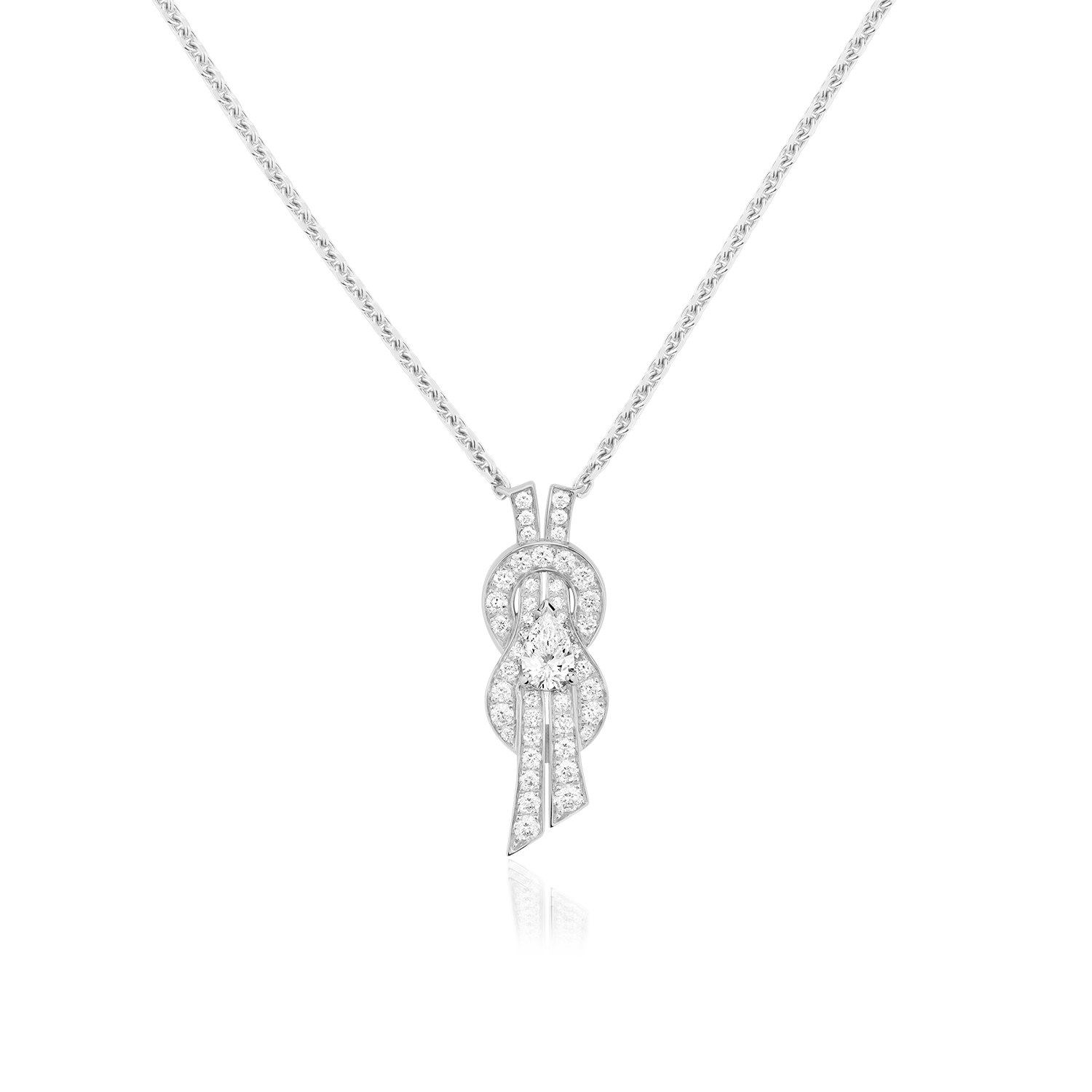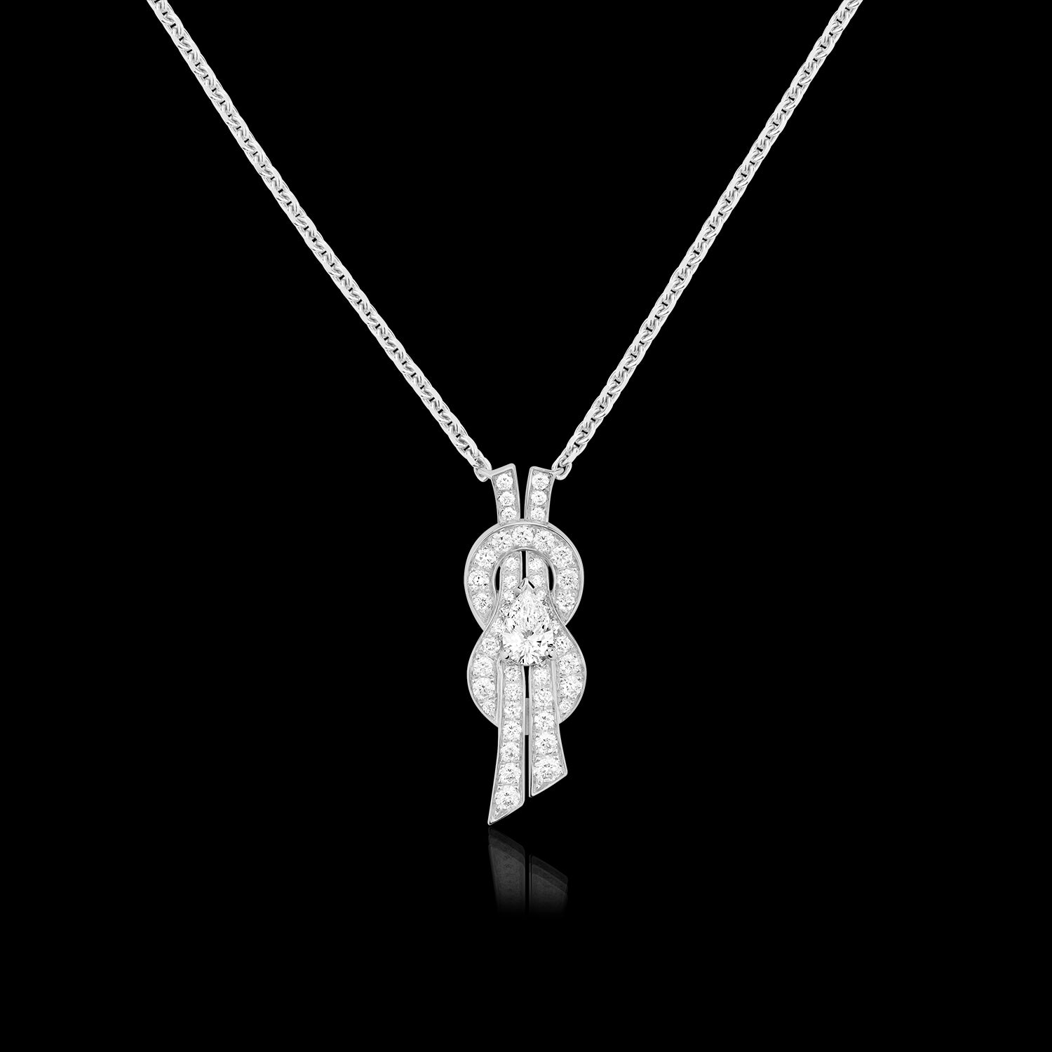 Colar Chance Infinie modelo médio em ouro branco e totalmente cravejado de diamantes brancos e uma pedra central.