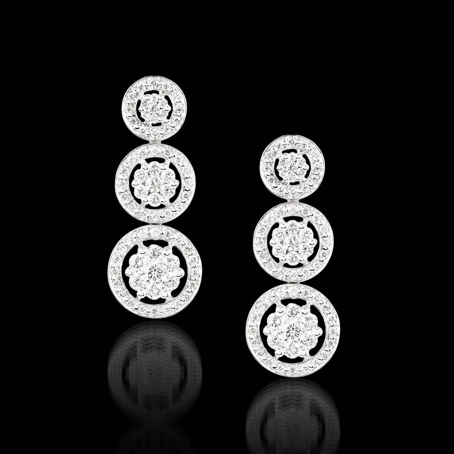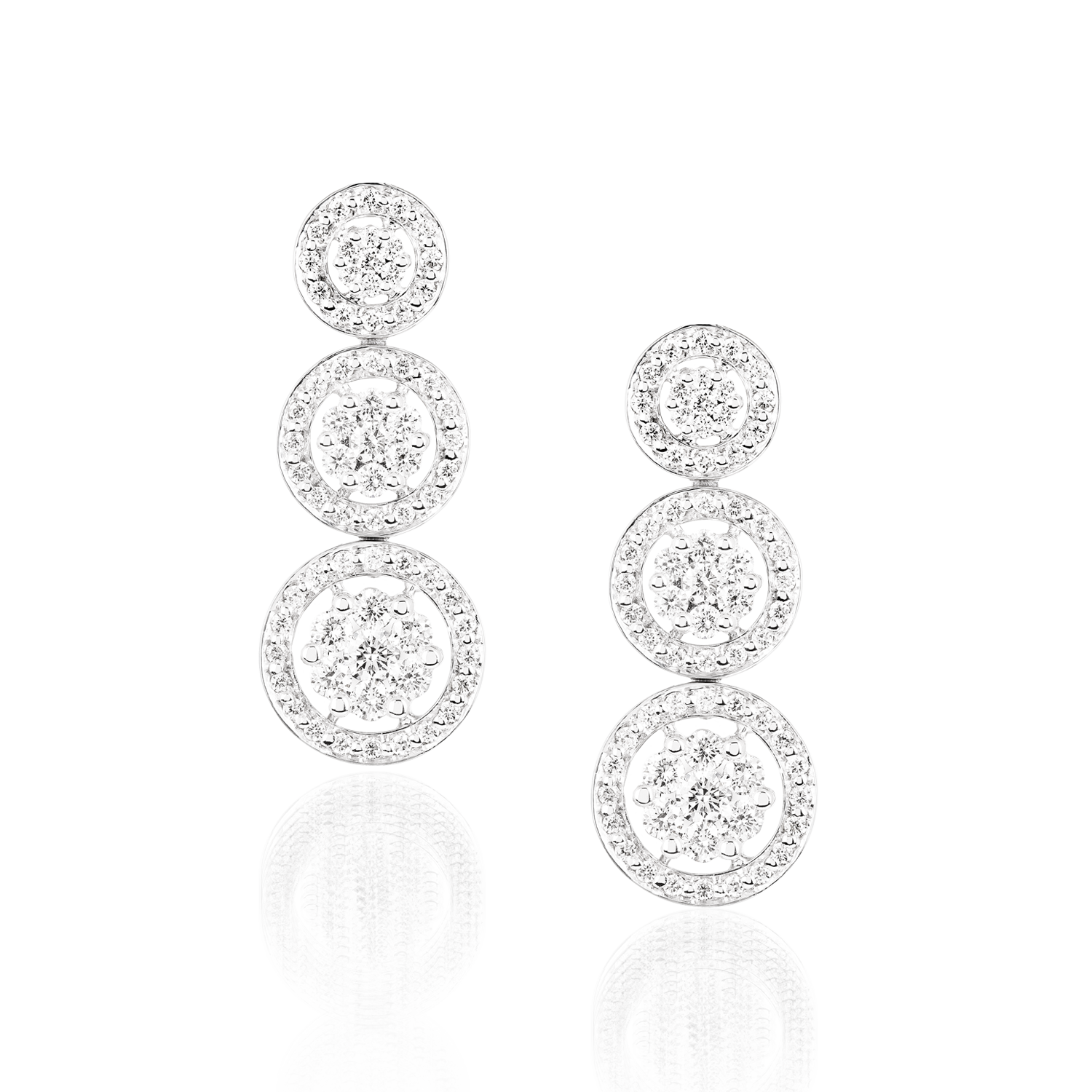 Brincos Peony em ouro branco de 18K com três rosetas de diamantes em talhe brilhante, molduradas por aros de diamantes talhe brilhante em pavé.
