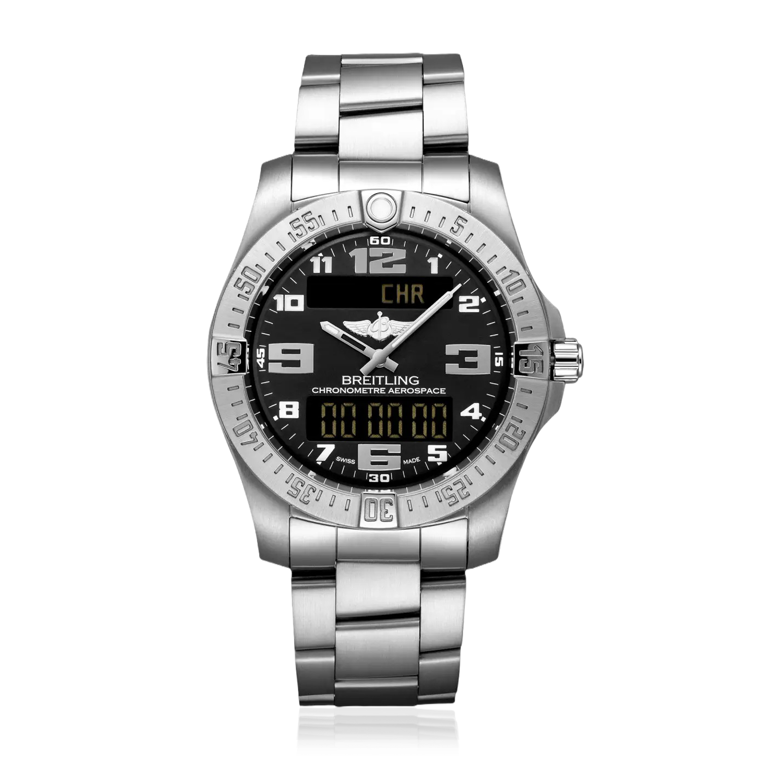 Em 1985, a Breitling lançou o Aerospace, um cronógrafo inovador e multifunções equipado com tecnologia suíça de última geração. Herdeiro deste lendário modelo, o Aerospace Evo mantém o mesmo estilo poderoso, dinâmico e técnico — combinado com os mais recentes desenvolvimentos eletrónicos. Equipado com um calibre SuperQuartz™ oficialmente certificado como cronómetro, este distingue-se por um sistema de controlo de fácil utilização com funções ativadas por coroa, incluindo o cronógrafo de 1/100 de segundo, temporizador de contagem decrescente, segundo fuso horário, alarme, sinal de áudio de tempo (repetidor de minutos) e calendário.