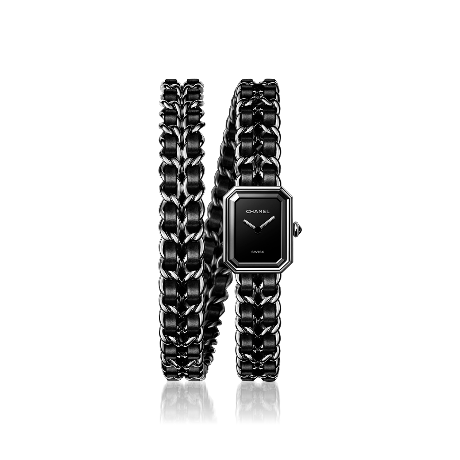 Bracelete de corrente com duas voltas em aço entrelaçada com tira em pele preta