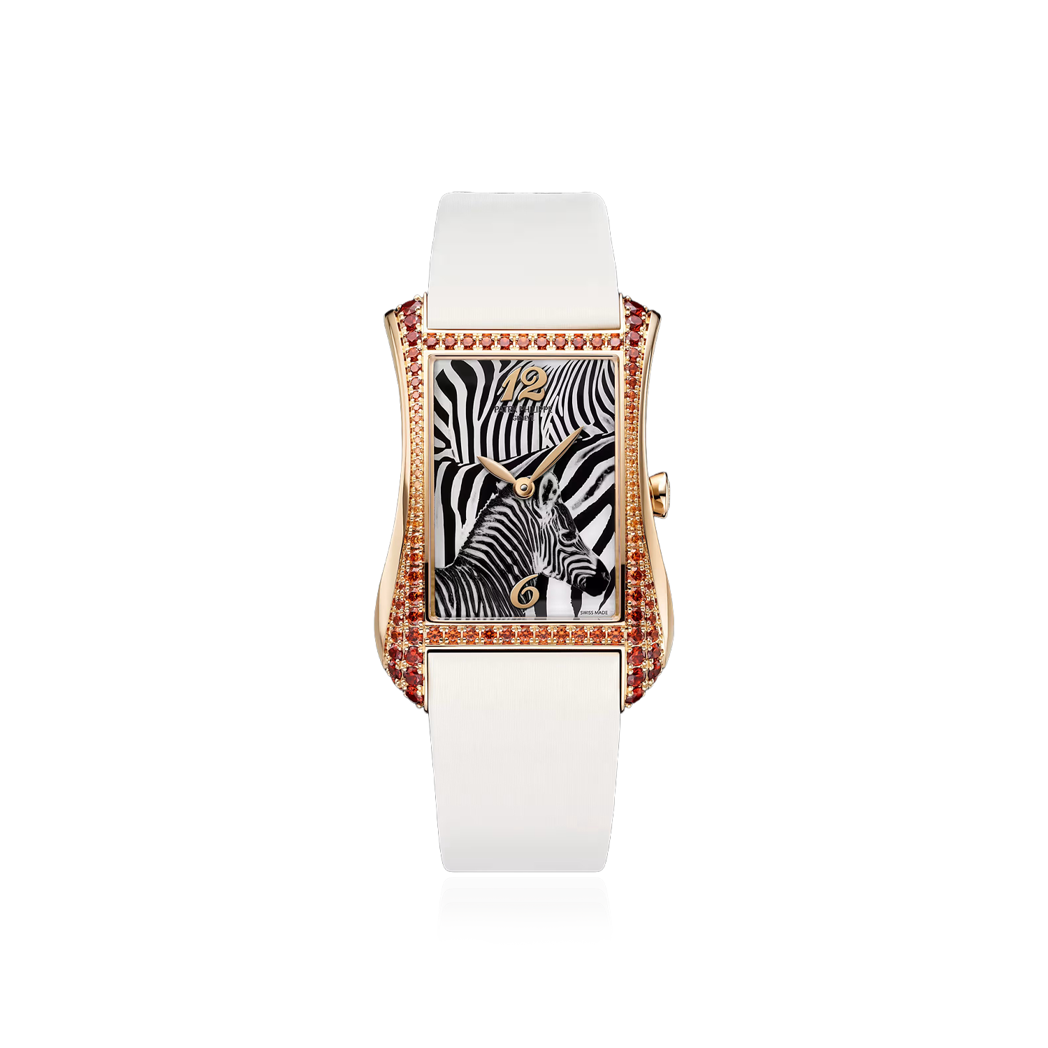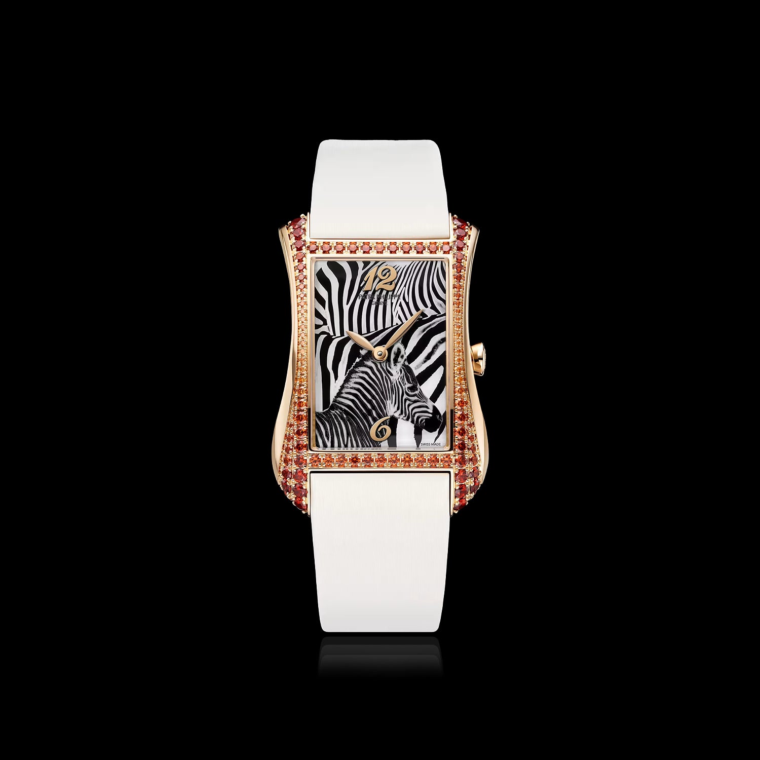 O novo Gondolo Serata distingue-se pelo seu mostrador em vidro de safira com um original motivo de zebra que cria efeitos de volume e de profundidade espantosos. A caixa em ouro rosa é cravejada com 94 espessartitas em talhe brilhante (2.02 cts) dispostas num duplo gradiente de cores que abrange um espetro que vai do conhaque aos tons de tangerina, acentuando o seu perfil delicadamente “cintado” e as suas curvas assimétricas.