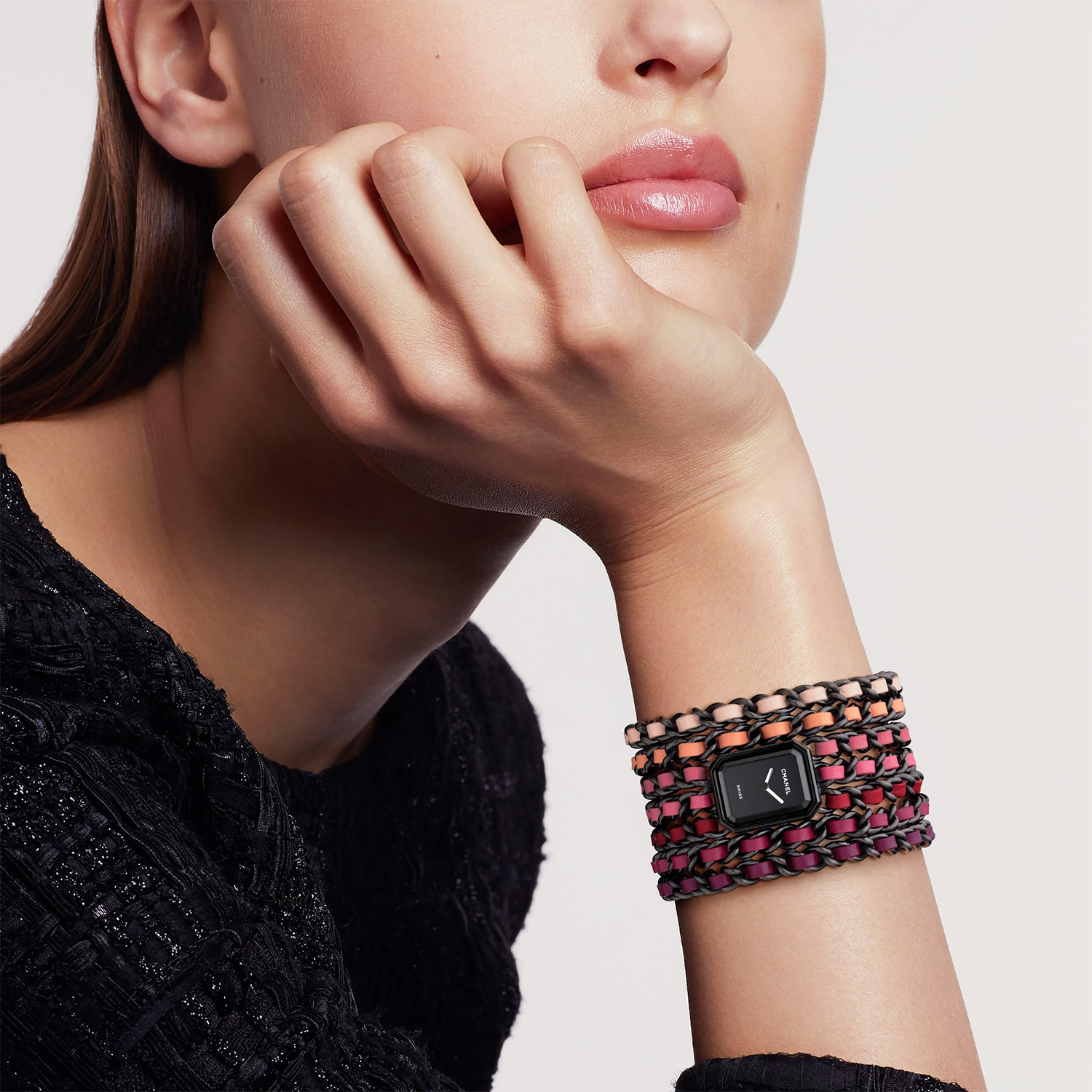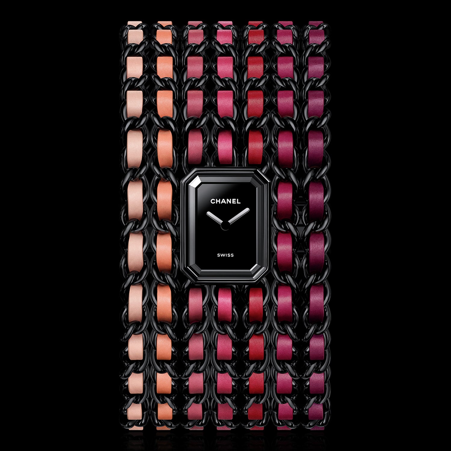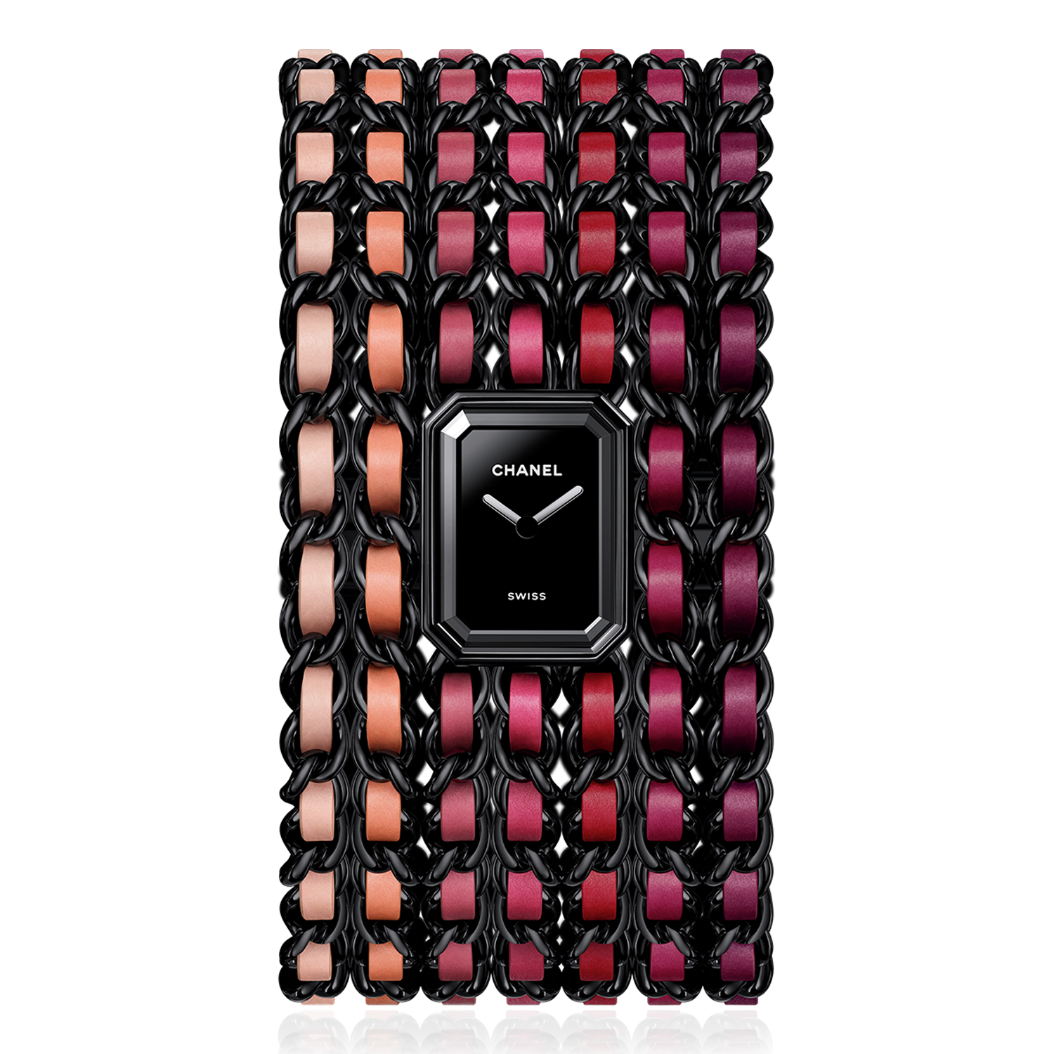 Bracelete com corrente em aço com revestimento preto entrelaçada com tiras de pele em tons de rosa e vermelho e fecho de báscula triplo em aço com revestimento preto