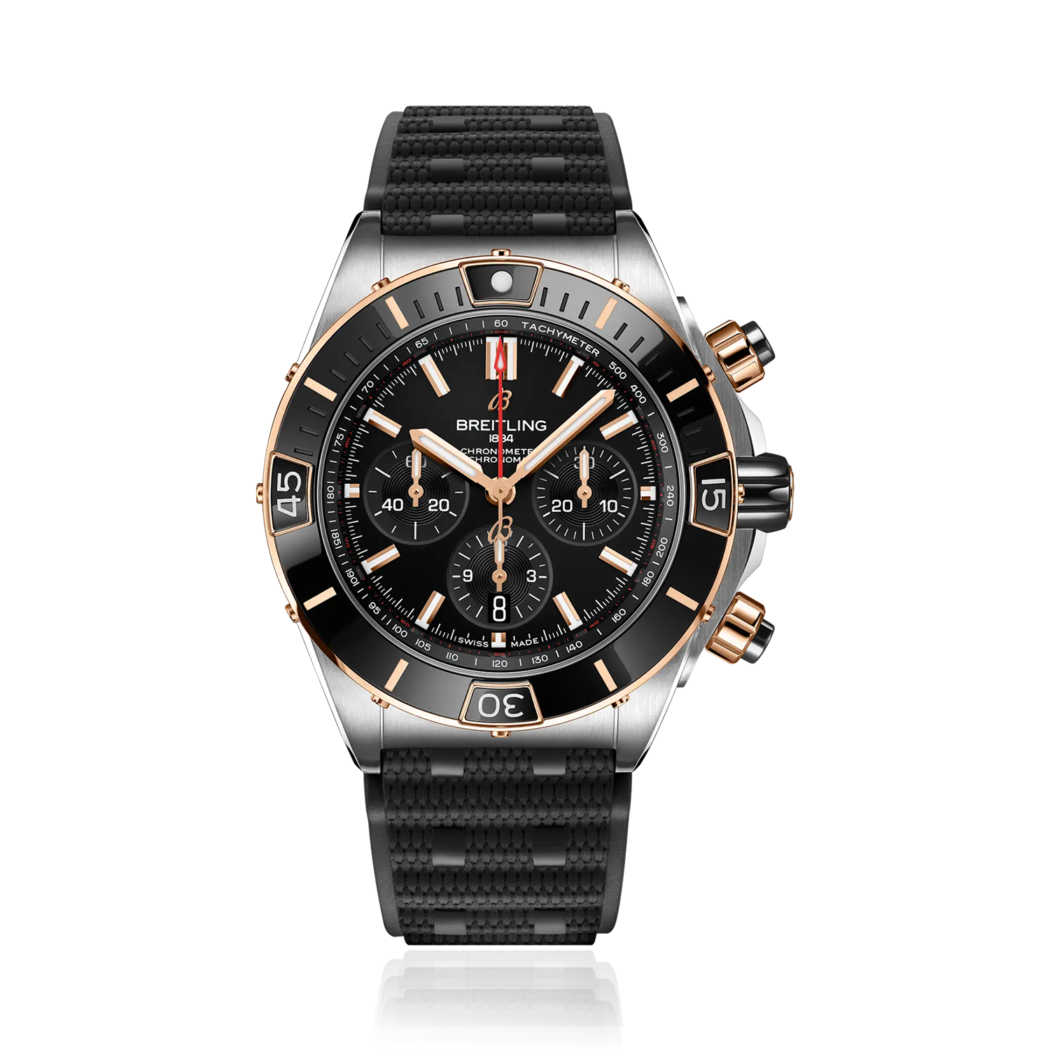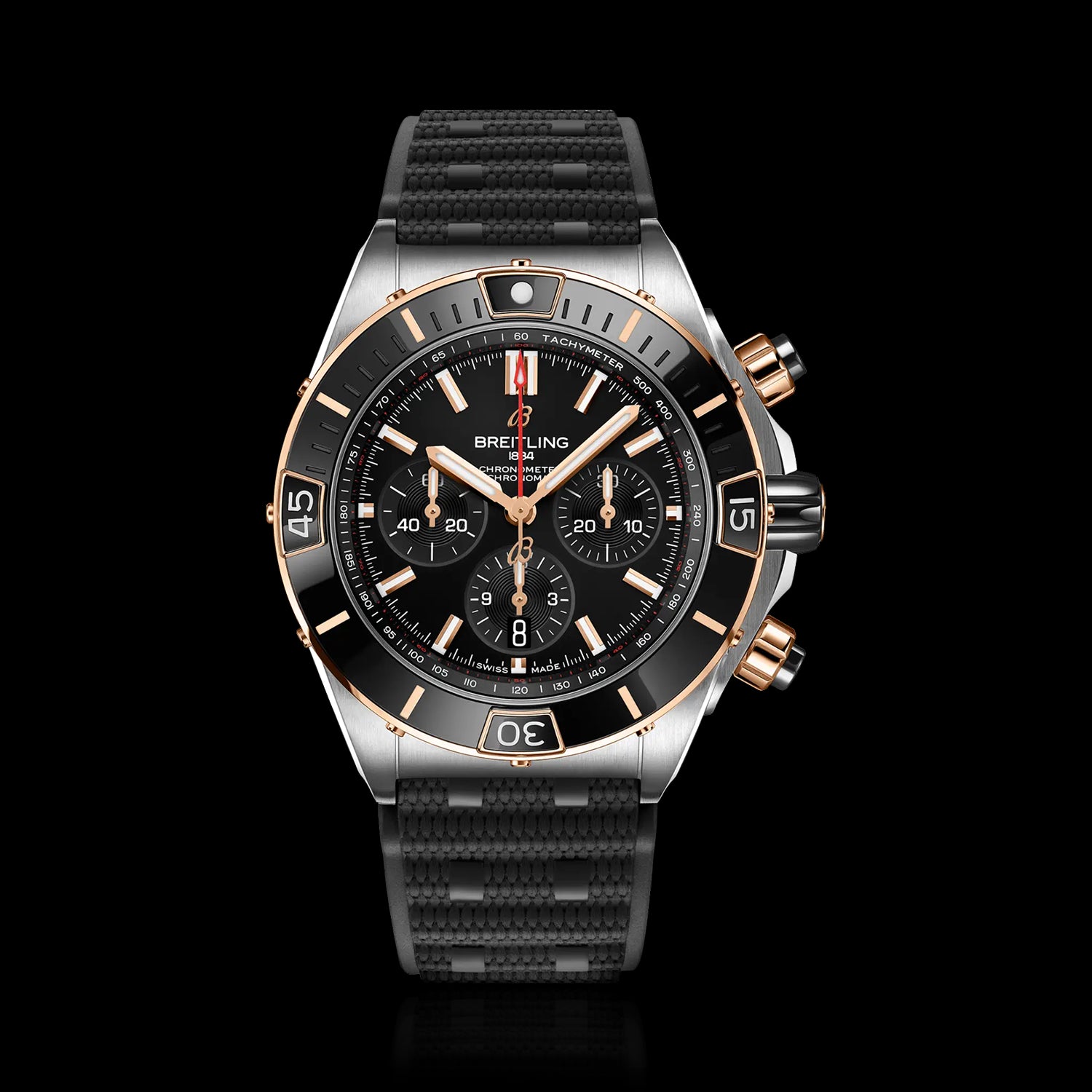O poderoso relógio da Breitling para todas as suas missões. O Super Chronomat é inspirado no Chronomat original da década de 1980, que a Breitling criou para as estrelas das equipas de voo acrobático.