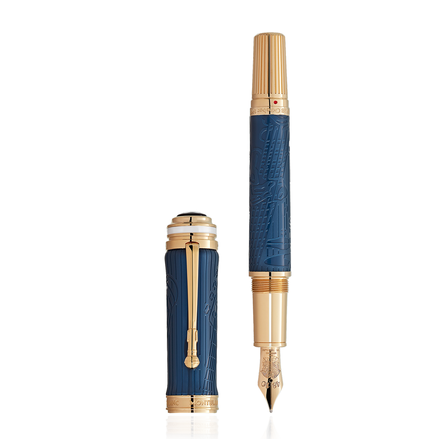 Na rica história da música rock, poucos nomes brilharam de forma tão consistente como o Queen. Com uma carreira que se estende por mais de cinco décadas, a banda é uma das mais bem-sucedidas de todos os tempos. Durante esse período, o Queen passou a incorporar o poder da criatividade musical e a maioria das suas canções ficou no topo das paradas durante semanas a fio. Eles criaram algo como o seu próprio universo musical, composto por uma combinação de hard rock, glam rock, pop, funk e ópera, quebrando as fronteiras entre os géneros. Inspirando-se no álbum Greatest Hits II, de 1991, a Montblanc homenageia com a edição especial Great Characters Homage to Queen um dos álbuns de maior sucesso do Queen. Ecoando a impressionante combinação de cores do LP duplo Greatest Hits II, a edição surge em azul escuro com detalhes banhados a ouro. Os quatro músicos por trás do som deste lendário álbum de compilação ficaram para a história: Freddy Mercury, o carismático vocalista com um alcance vocal de várias oitavas e um vibrato rico; Brian May, o virtuoso guitarrista e o seu inconfundível som de guitarra elétrica; John Deacon, o baixista versátil e criativo; e Roger Taylor, o coração rítmico da banda. Como sinal do seu virtuosismo musical, que tornou o álbum de 1991 um dos mais vendidos e conhecidos do mundo, as «ferramentas do seu ofício» estão subtilmente imortalizadas na preciosa resina: microfone e baixo na tampa; guitarra e bateria no corpo.