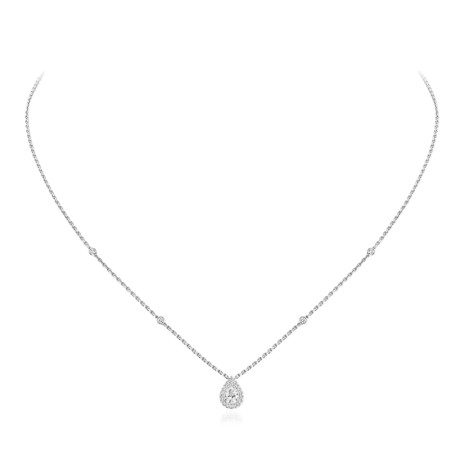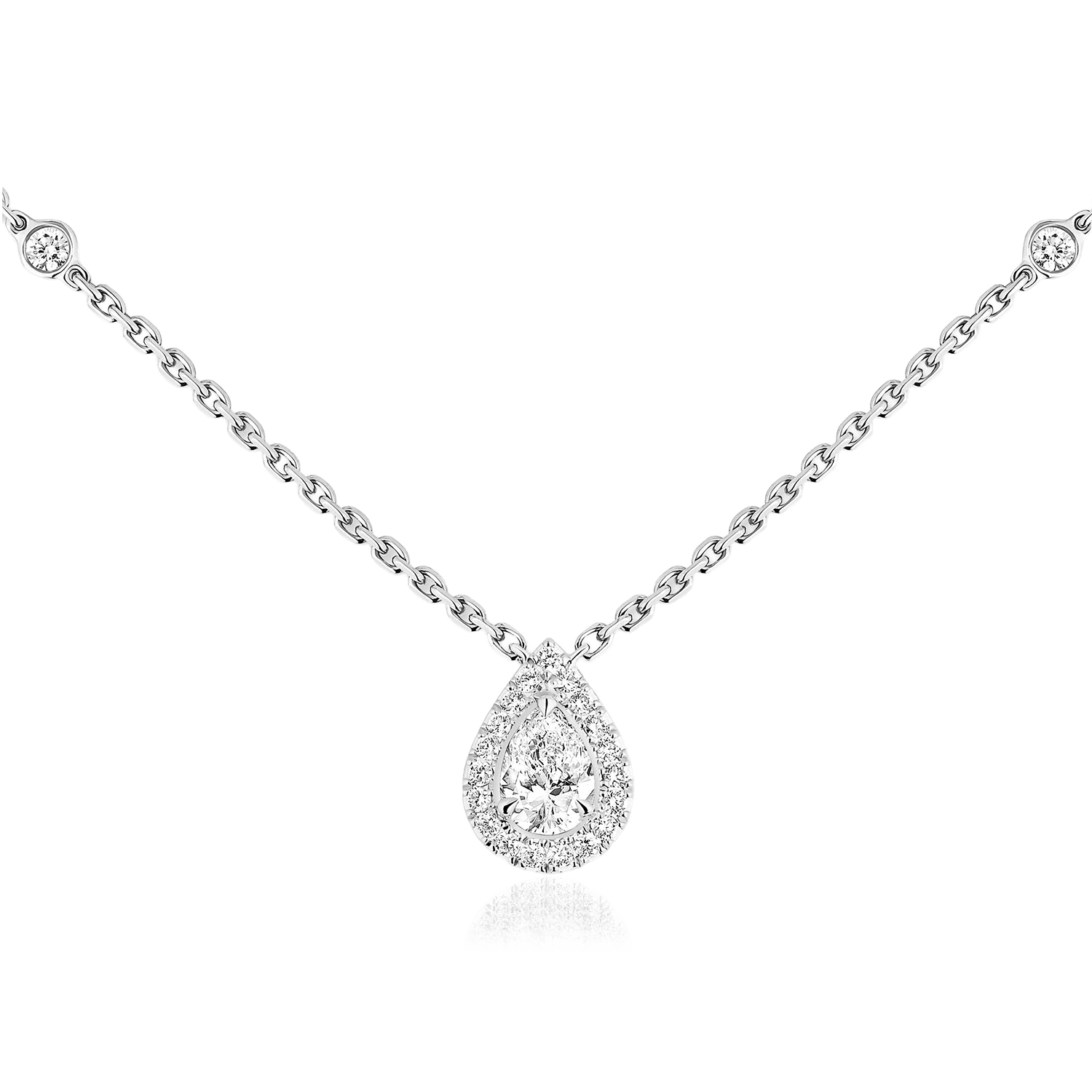 Este colar Joy em ouro branco de 18 quilates e diamantes em talhe pêra celebra este tipo de lapidação, conhecido pelo seu brilho incomparável. Uma sensualidade feminina surge do diamante em forma de pêra, desde a sua ponta afiada até ao seu lado oposto arredondado, uma vantagem ideal para o decote. A sua forma alongada realça a beleza das mãos. Neste colar de diamantes em ouro branco, a pêra de 0.25 ct é cuidadosamente selecionada pelas suas proporções harmoniosas, pela sua simetria agradável, os principais critérios de brilho da pedra. A auréola de diamantes em talhe brilhante enfatiza o brilho incomparável desta forma.