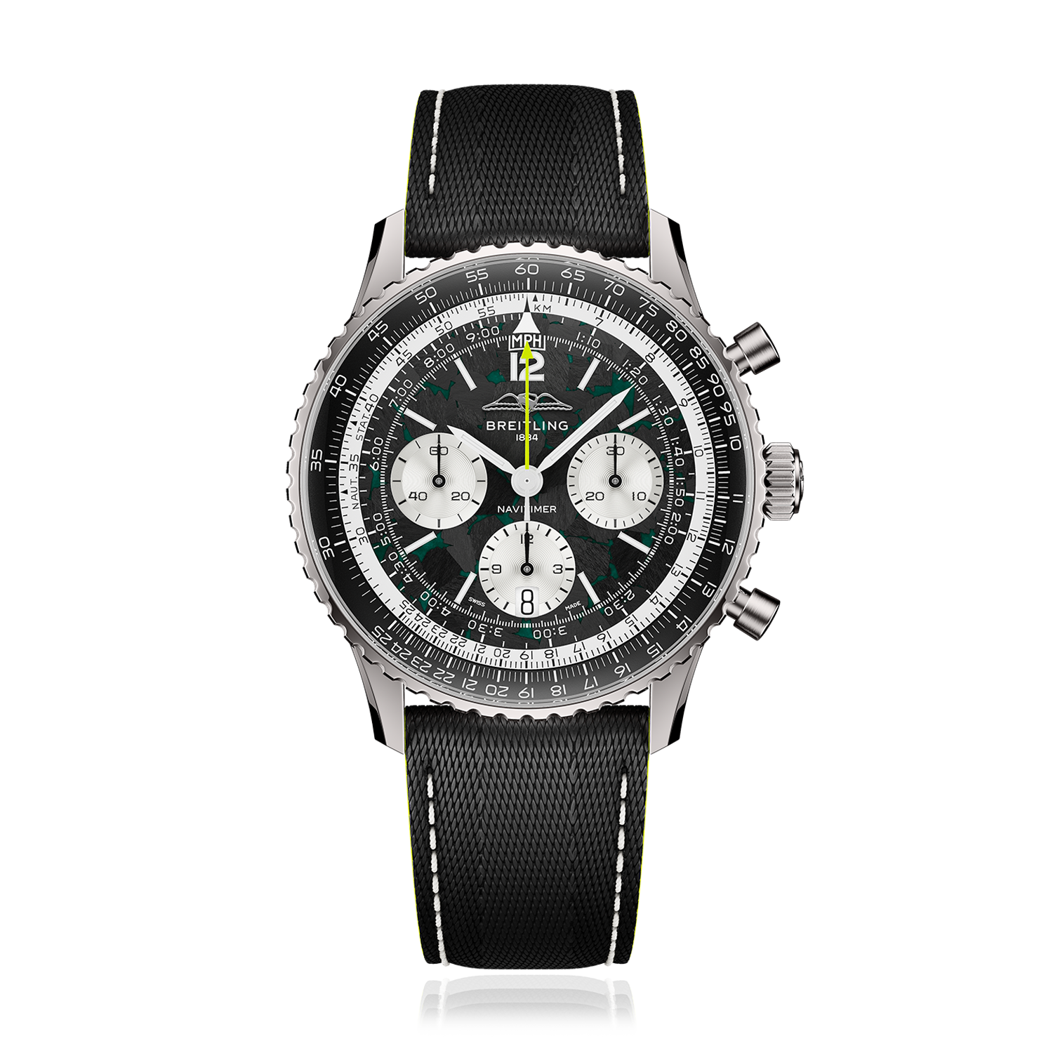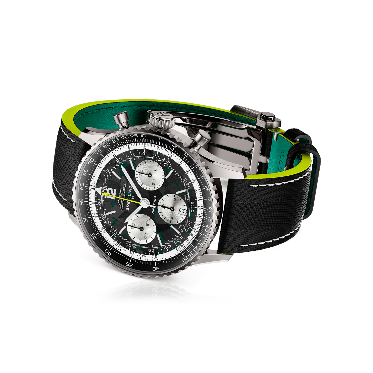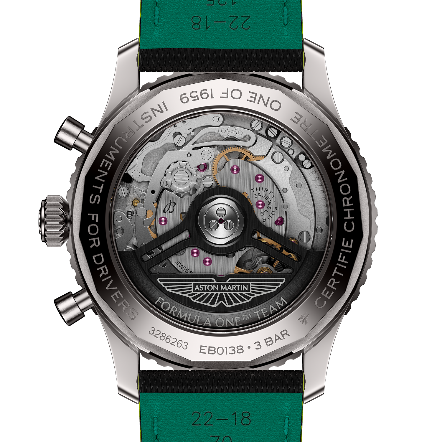 O primeiro relógio coassinado desta parceria devolve o Navitimer ao universo das corridas. Limitado a 1959 exemplares, presta homenagem ao ano em que a Aston Martin se estreou na Fórmula 1®. Cada elemento do Navitimer B01 Chronograph 43 Aston Martin Aramco Formula One™ Team reflete desempenho: o *Racing Green* da Aston Martin e os apontamentos em verde-lima inspirados na decoração da Aston Martin Aramco, uma caixa leve em titânio — utilizada pela primeira vez num Navitimer — e um mostrador em fibra de carbono, inspirado nos materiais presentes no cockpit de um monolugar de F1®. A bracelete em pele texturizada evoca um arnês de competição, enquanto a visibilidade noturna reforçada garante uma leitura perfeita em quaisquer condições. O fundo da caixa em safira revela o “motor” do relógio: o Calibre de Manufatura Breitling 01, um cronómetro certificado pelo COSC com uma reserva de marcha de 70 horas, concebido para uma precisão absoluta mesmo sob pressão. O rotor preto mate, desenvolvido especialmente para esta edição, é fabricado em tungsténio revestido com PVD (deposição física de vapor) de elevada durabilidade e ostenta o logótipo da Aston Martin Formula One™ Team. Outras gravações no fundo da caixa incluem “One of 1959” e a expressão “Instruments for Drivers”.
