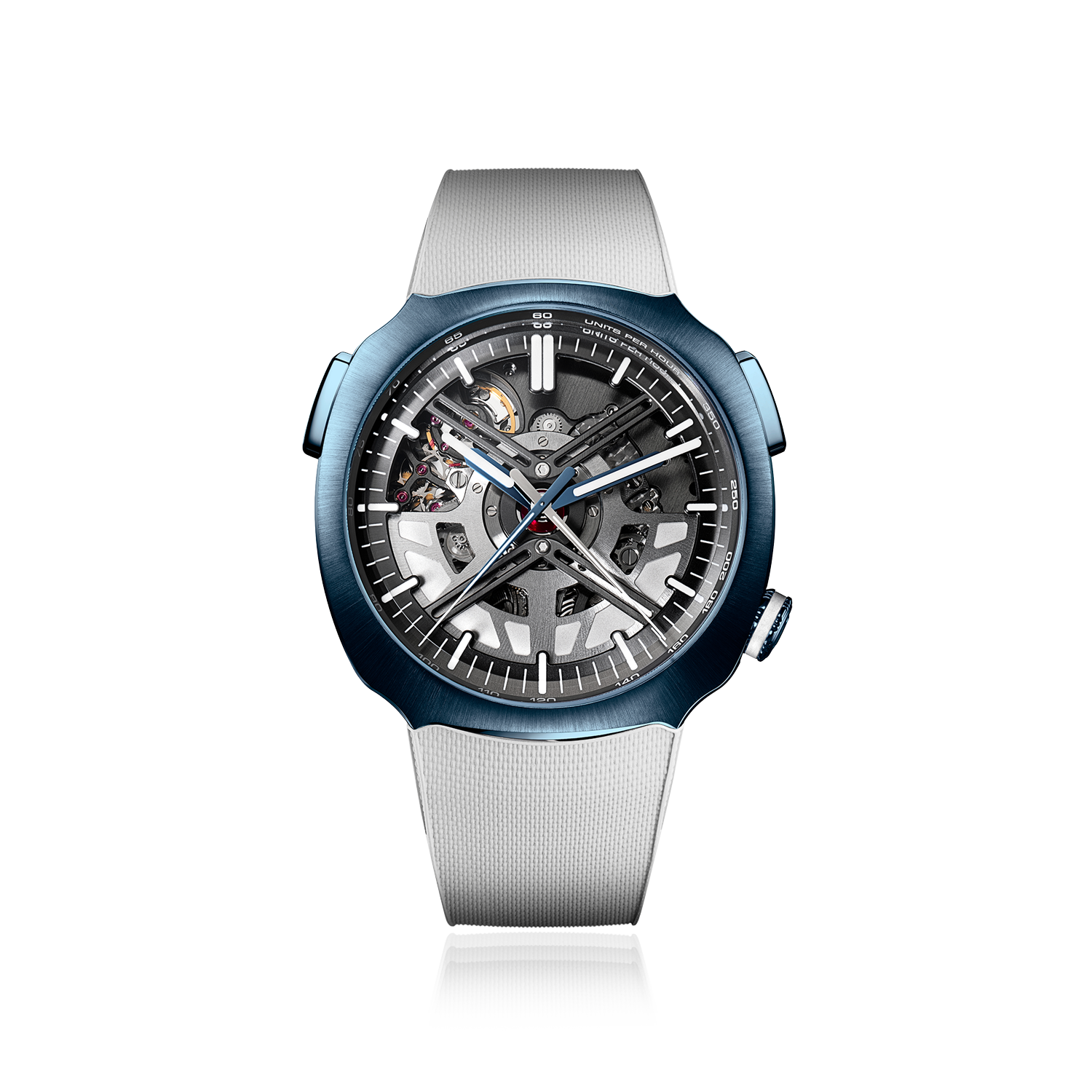 Nascido do desejo dos pilotos da Alpine por um relógio tão elegante quanto os seus monolugares, o Streamliner Alpine Drivers Edition leva a nossa colaboração com a Alpine Motorsports ao seu limite mecânico. Cada detalhe é inspirado nas pistas de corrida: duas pontes em forma de V remetem às suspensões dos monolugares; a ponte central do movimento na parte traseira da caixa evoca um capacete de corrida; o rotor ecoa um aro de roda do Alpine A110. Por baixo do capot, encontra-se o HMC 700, o primeiro movimento cronógrafo esqueletizado da marca. Priorizando o minimalismo e a legibilidade, o relógio apresenta minutos e segundos centrais, uma função flyback e nenhum submostrador.